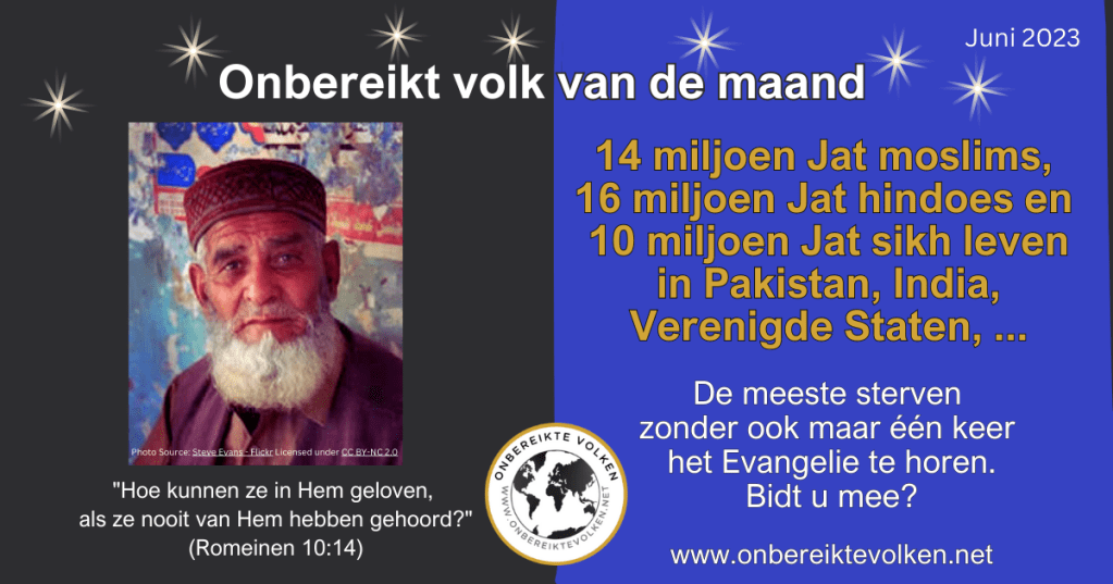 De Jat bevolking telt meer dan 40 miljoen kostbare zielen. Zij leven vooral in Pakistan, India en de Verenigde Staten, maar ook in Bangladesh en Nepal. De meeste Jat gaan de eeuwigheid in zonder ook maar één keer de naam van Jezus te horen, laat staan het Evangelie, de Blijde Boodschap. Ons gebed vandaag kan en zal een verschil maken.