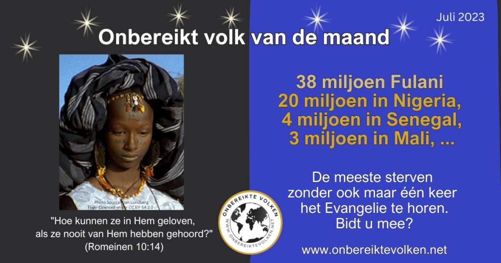 De Fulani bevolking telt meer dan 38 miljoen kostbare zielen. Zij leven vooral in Nigeria, Senegal en Mali. De meeste Fulani gaan de eeuwigheid in zonder ook maar één keer de naam van Jezus te horen.