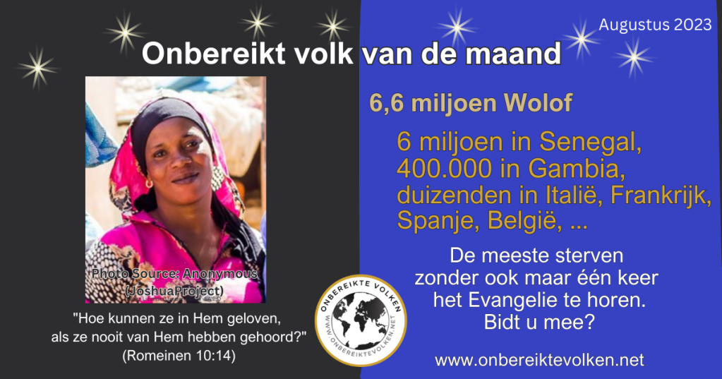 DE WOLOF BEVOLKING telt bijna 7 miljoen kostbare zielen. Zij leven vooral in Senegal, Gambia, Italië en Frankrijk. De meeste Wolof gaan de eeuwigheid in zonder ook maar één keer de naam van Jezus te horen.