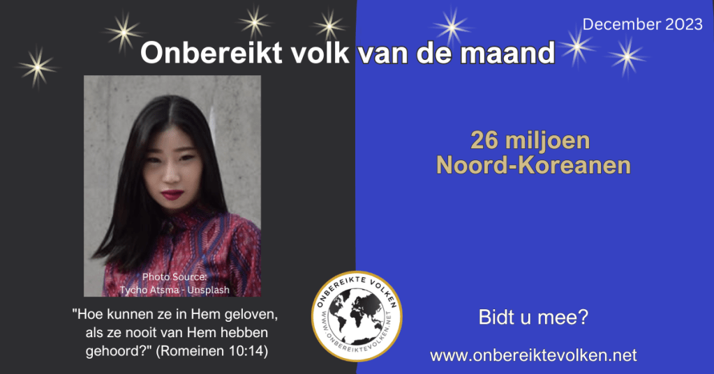 De Noord-Koreaanse bevolking telt meer dan 26 miljoen kostbare zielen. De meeste Noord-Koreanen gaan de eeuwigheid in zonder ook maar één keer de naam van Jezus te horen. Ons gebed maakt verschil. Bidt u, uw gezin, uw kerk ook voor de Noord-Koreaanse bevolking vandaag, deze maand?