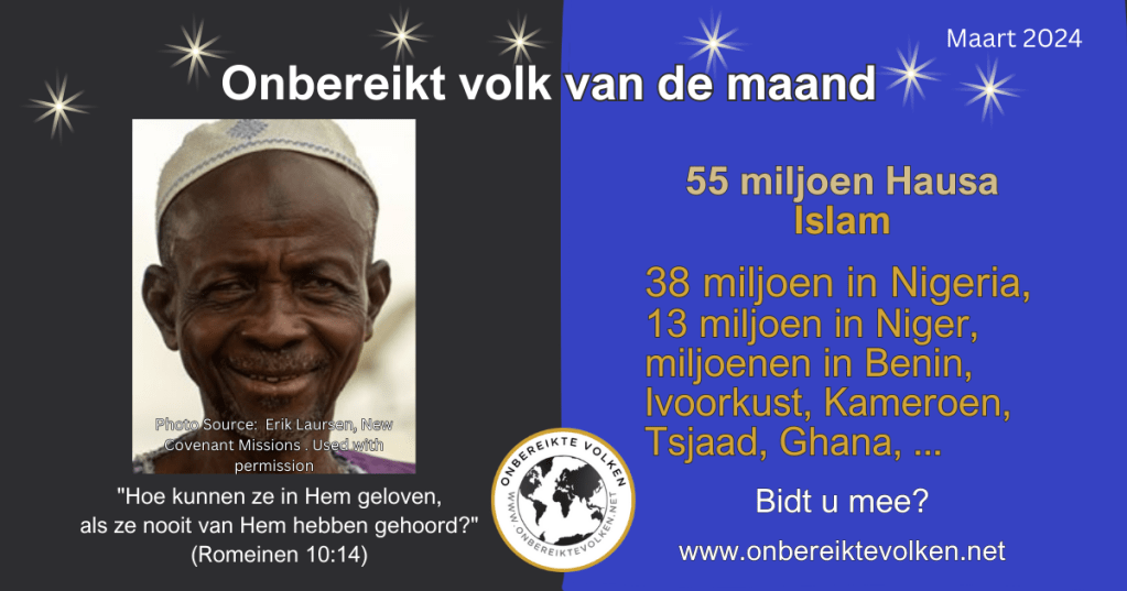 De Hausa zijn het grootste volk in West-Afrika. Volgens de info op de JoshuaProject website leven er minstens 55 miljoen Hausa en leven ze in niet minder dan 16 landen. (Andere bronnen vermelden cijfers tot wel 70 of 80 miljoen Hausa.) Islam is het dominerende geloof en Nigeria, waar de meeste Hausa leven, staat op nummer 6 op de Open Doors ranglijst voor christenvervolging. Ons gebed voor het Hausa volk is van levensbelang!