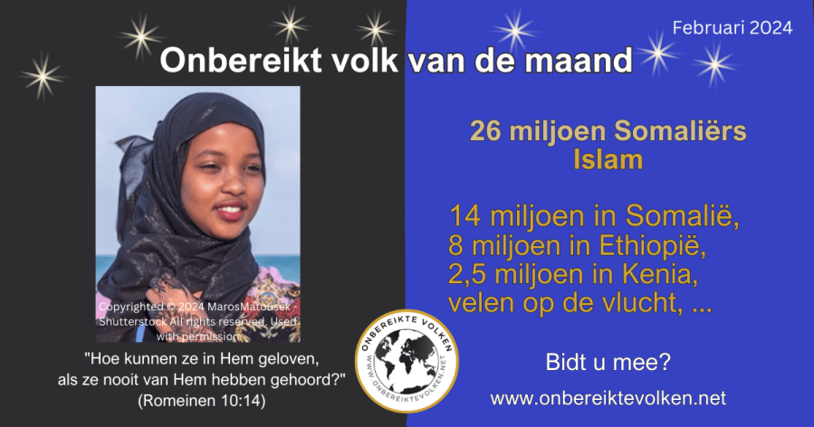 De Somalische bevolking telt meer dan 26 miljoen mensen. Ondanks extreme christenvervolging mogen we geloven dat veel Somaliërs deel zullen uitmaken van de schare die niemand tellen kan. (Openbaring 7:9) Daarom bidden we vol van geloof voor het Somalische volk deze maand! Bidt u, uw gezin, uw kerk ook voor de Somalische bevolking deze maand?