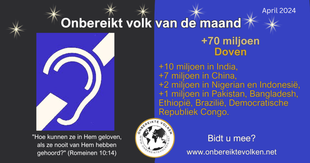 Wenst u ons te helpen om meer mensen te motiveren om te bidden voor doven wereldwijd? Deel dan deze info via uw kerkblad, e-mail, website, sociale media,…