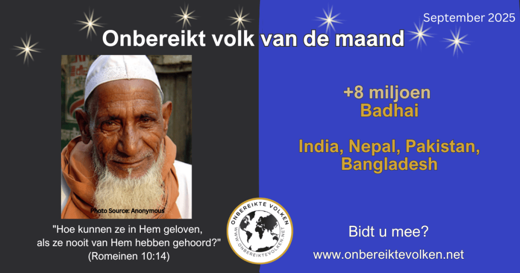 Wenst u ons te helpen om meer mensen te motiveren om te bidden voor de Badhai en andere onbereikte bevolkingsgroepen? Deel dan deze info via uw kerkblad, e-mail, website, sociale media,…