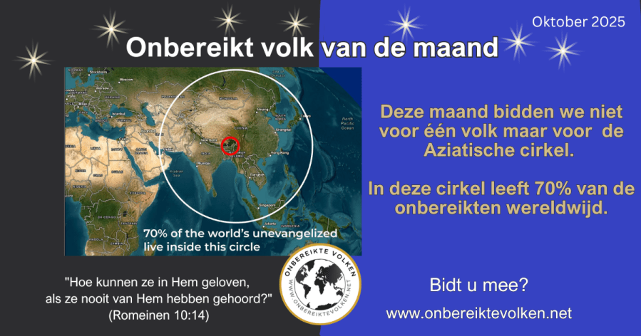 Deze maand bidden we niet voor een specifiek volk maar voor een bijzonder gebied als we aan onbereikte volken denken. Een gebied waarin 70% van de nog te bereiken mensen die er op onze wereldbol leven, leven. Men noemt het ook weleens de Aziatische cirkel. Kijk maar op het plaatje en bid !