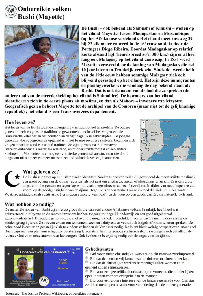 Wenst u ons te helpen om meer mensen te motiveren om te bidden voor de Bushi en andere onbereikte bevolkingsgroepen? Deel dan deze info via uw kerkblad, e-mail, website, sociale media,…